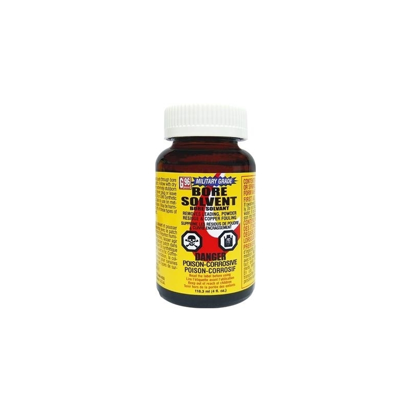 Safe to use on metals. Will not cause rust, oxidation, staining, or galvanic corrosion. May be harmful to some paints, varnishes, and plastics. Keep product off of these types of surfaces unless a previous patch test has shown no effect. It is recommended that the firearm be re-treated with G96 Gun Treatment, G96 Gun Oil, or G96 Synthetic CLP Gun Oil after use. Directions for use: Saturate patch with bore solvent and push through bore from breech and out muzzle. Repeat with clean saturated patch. Follow with dry patch. Repeat wet-dry patch process until bore is clean. For stubborn deposits, leave on for up to 60 minutes before removing. Never plug or leave patch in bore. Re-treat with G96 Gun Treatment, G96 Gun Oil or G96 Synthetic CLP Gun Oil. Run a dry patch through bore before firing. Safe to use on metals. Will not cause rust, oxidation, staining or galvanic corrosion. May be harmful to some paints, varnishes, and plastics. Keep product off of these types of surface unless a previous patch test has shown no effect. For firearms use only.